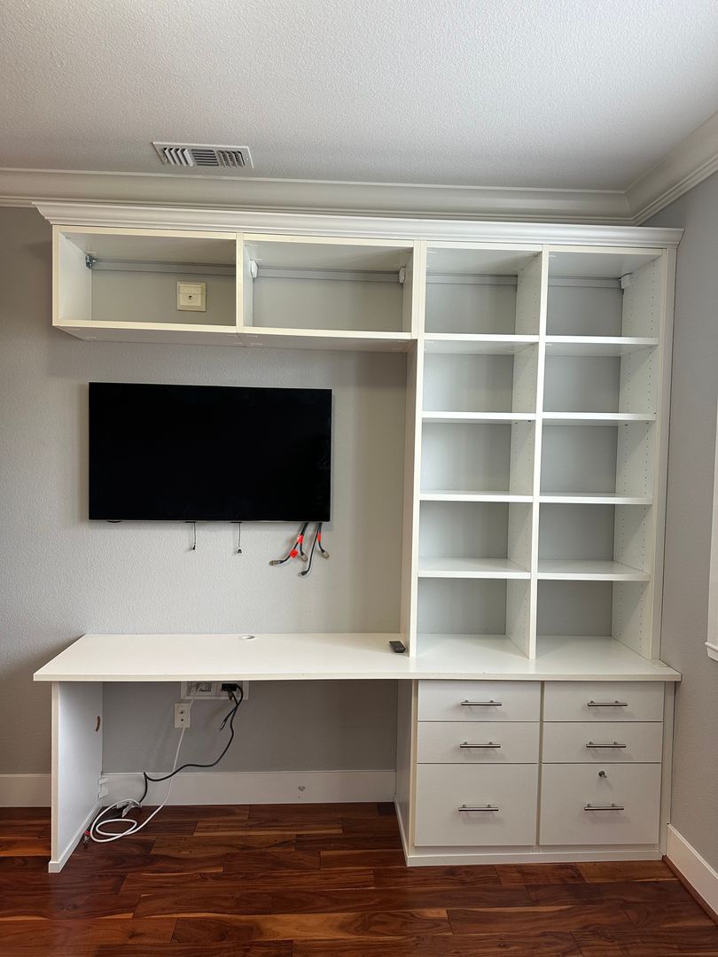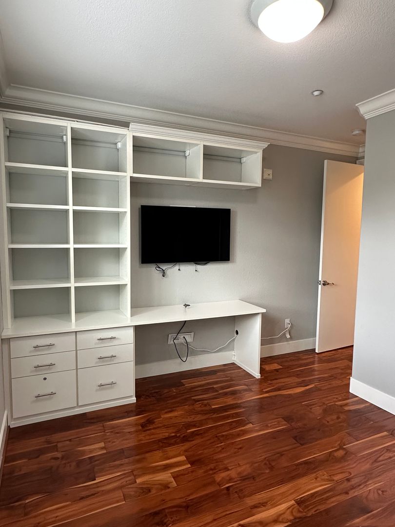 Upstairs: 3 bedrooms. Two guest/children's rooms have large closets with California Closet built in storage, wall mounted TV in place.