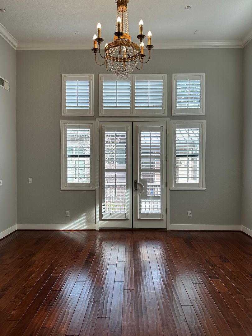Wide plantation shutters give all the windows privacy.